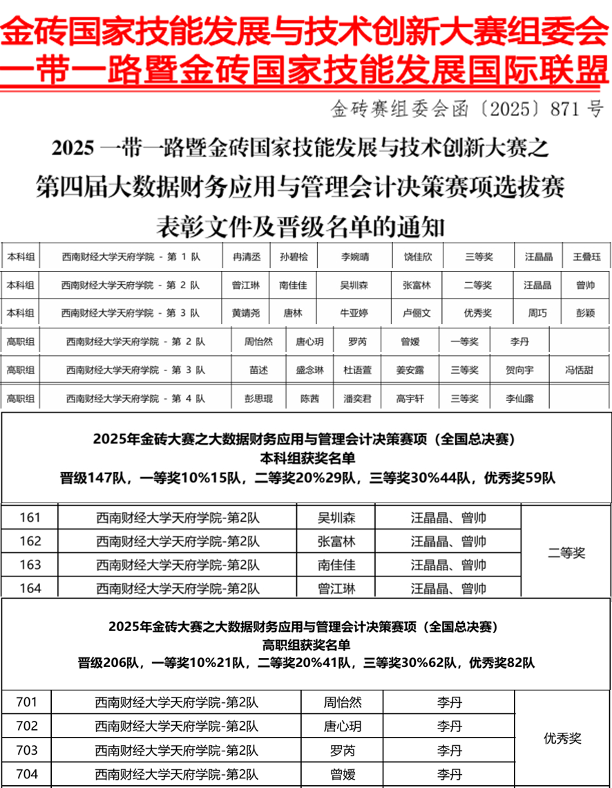 近日,由金砖国家工商理事会中方理事会、“一带一路”暨金砖国家技能发展国际联盟主办,金砖国家工商理事会(中方)技能发展工作组承办的2025 “一带一路”暨金砖国家技能发展与技术创新大赛大数据财务应用与管理会计决策赛项落下帷幕。会计学院学子获得了选拔赛本科组三等奖和优秀奖各1项,高职组三等奖2项;决赛本科组二等奖1项,高职组优秀奖1项。