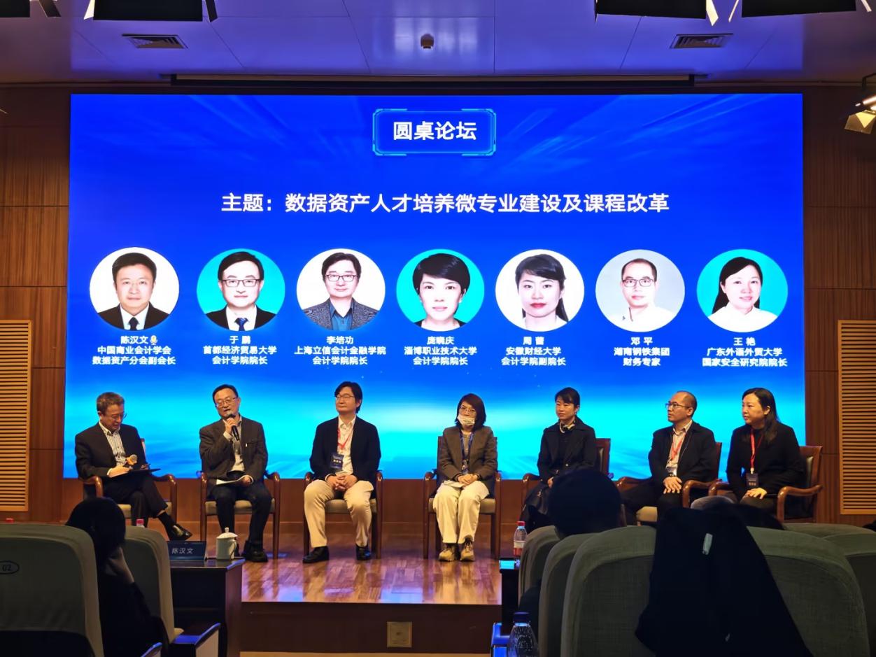 主题报告后,中国商业会计学会数据资产分会副会长、南京审计大学教授陈汉文主持圆桌论坛,首都经济贸易大学会计学院院长于鹏、上海立信会计金融学院会计学院院长李培功、淄博职业技术大学会计学院院长庞晓庆、安徽财经大学会计学院副院长周蕾、湖南钢铁集团财务专家邓平、广东外语外贸大学国家安全研究院院长王艳等嘉宾,围绕 “数据资产人才培养微专业建设及课程改革” 展开热烈讨论,形成多项兼具理论价值与实践意义的共识。